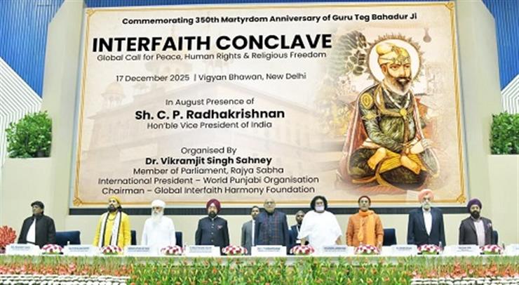ਨਵੀਂ ਦਿੱਲੀ - ਸ਼੍ਰੀ ਗੁਰੂ ਤੇਗ ਬਹਾਦਰ ਜੀ ਦੇ 350ਵੇਂ ਸ਼ਹੀਦੀ ਪੁਰਬ ਨੂੰ ਸਮਰਪਿਤ ਇੱਕ ਅੰਤਰ-ਧਰਮ ਸੰਮੇਲਨ ਅੱਜ ਵਿਸ਼ਵ ਪੰਜਾਬੀ ਸੰਗਠਨ ਅਤੇ ਗਲੋਬਲ ਇੰਟਰਫੇਥ ਹਾਰਮਨੀ ਫਾਊਂਡੇਸ਼ਨ ਦੁਆਰਾ, ਇਸਦੇ ਅੰਤਰਰਾਸ਼ਟਰੀ ਪ੍ਰਧਾਨ ਡਾ. ਵਿਕਰਮਜੀਤ ਸਿੰਘ ਸਾਹਨੀ, ਸੰਸਦ ਮੈਂਬਰ, ਰਾਜ ਸਭਾ ਦੀ ਅਗਵਾਈ ਹੇਠ ਨਵੀ ਦਿੱਲੀ ਦੇ ਵਿਗਿਆਨ ਭਵਨ ਵਿਖੇ ਆਯੋਜਿਤ ਕੀਤਾ ਗਿਆ। ਇਸ ਸੰਮੇਲਨ ਵਿਚ ਸਿੱਖ ਧਰਮ, ਹਿੰਦੂ ਧਰਮ, ਇਸਲਾਮ, ਈਸਾਈ ਧਰਮ ਅਤੇ ਜੈਨ ਧਰਮ ਦੇ ਉੱਘੇ ਅਧਿਆਤਮਿਕ ਆਗੂਆਂ ਨੇ ਧਾਰਮਿਕ ਆਜ਼ਾਦੀ, ਬਹੁਲਵਾਦ ਅਤੇ ਸ਼ਾਂਤੀਪੂਰਨ ਸਹਿ-ਹੋਂਦ ਦੇ ਭਾਰਤ ਦੇ ਸੱਭਿਅਕ ਸਿਧਾਂਤਾਂ ਪ੍ਰਤੀ ਵਚਨਬੱਧਤਾ ਪ੍ਰਗਟ ਕੀਤੀ। ਭਾਰਤ ਦੇ ਉਪ ਰਾਸ਼ਟਰਪਤੀ, ਸ਼੍ਰੀ ਸੀ. ਪੀ. ਰਾਧਾਕ੍ਰਿਸ਼ਨਨ ਨੇ ਸ੍ਰੀ ਗੁਰੂ ਤੇਗ ਬਹਾਦਰ ਜੀ ਨੂੰ ਸ਼ਰਧਾਂਜਲੀ ਭੇਟ ਕਰਦਿਆਂ, ਉਨ੍ਹਾਂ ਦੀ ਸ਼ਹਾਦਤ ਨੂੰ ਭਾਰਤ ਦੇ ਧਰਮ ਨਿਰਪੱਖ ਲੋਕਤੰਤਰ ਦੀ ਨੈਤਿਕ ਨੀਂਹ ਦੱਸਿਆ। ਉਨ੍ਹਾਂ ਕਿਹਾ ਕਿ 1675 ਵਿੱਚ ਗੁਰੂ ਜੀ ਦਾ ਬਲੀਦਾਨ ਧਾਰਮਿਕ ਆਜ਼ਾਦੀ ਦੀ ਰੱਖਿਆ ਵਿੱਚ ਹਿੰਮਤ ਦਾ ਪ੍ਰਤੀਕ ਸੀ ਅਤੇ ਇਸ ਗੱਲ 'ਤੇ ਜ਼ੋਰ ਦਿੱਤਾ ਕਿ ਇਹ ਸੰਮੇਲਨ ਭਾਰਤ ਦੇ ਸਭਿਅਕ ਸਿਧਾਂਤ ਵਸੁਧੈਵ ਕੁਟੁੰਬਕਮ ਦੇ ਸਿਧਾਂਤ ਨੂੰ ਦਰਸਾਉਂਦਾ ਹੈ। ਉਪ ਰਾਸ਼ਟਰਪਤੀ ਨੇ ਜ਼ੋਰ ਦੇ ਕੇ ਕਿਹਾ ਕਿ ਅਸਹਿਣਸ਼ੀਲਤਾ ਨੂੰ ਦੂਰ ਕਰਨ ਅਤੇ ਵਿਭਿੰਨਤਾ ਵਾਲੇ ਦੇਸ਼ ਭਾਰਤ ਵਿੱਚ ਏਕਤਾ ਨੂੰ ਉਤਸ਼ਾਹਿਤ ਕਰਨ ਲਈ ਅੰਤਰ-ਧਰਮ ਸੰਵਾਦ ਜ਼ਰੂਰੀ ਹੈ। ਆਪਣੇ ਸੰਬੋਧਨ ਵਿੱਚ, ਡਾ. ਵਿਕਰਮਜੀਤ ਸਿੰਘ ਸਾਹਨੀ ਨੇ ਸ੍ਰੀ ਗੁਰੂ ਤੇਗ ਬਹਾਦਰ ਜੀ ਦੇ ਸਰਵਉੱਚ ਬਲੀਦਾਨ ਨੂੰ ਮਨੁੱਖੀ ਅਧਿਕਾਰਾਂ ਦੇ ਵਿਸ਼ਵ ਇਤਿਹਾਸ ਵਿੱਚ ਇੱਕ ਮਹੱਤਵਪੂਰਨ ਪਲ ਵਜੋਂ ਯਾਦ ਕੀਤਾ। ਉਨ੍ਹਾਂ ਕਿਹਾ ਕਿ ਧਾਰਮਿਕ ਆਜ਼ਾਦੀ ਇੱਕ ਸੱਭਿਅਕ ਸਮਾਜ ਦੀ ਨੀਂਹ ਹੈ ਅਤੇ ਇਸ ਗੱਲ 'ਤੇ ਜ਼ੋਰ ਦਿੱਤਾ ਕਿ ਗੁਰੂ ਤੇਗ ਬਹਾਦਰ ਜੀ ਦੀ ਸ਼ਹਾਦਤ ਸਿਰਫ਼ ਇੱਕ ਵਿਸ਼ਵਾਸ ਲਈ ਨਹੀਂ ਸੀ, ਸਗੋਂ ਹਰ ਵਿਅਕਤੀ ਦੇ ਡਰ ਤੋਂ ਬਿਨਾਂ ਆਪਣੇ ਧਰਮ ਦਾ ਪਾਲਣ ਕਰਨ ਦੇ ਅਧਿਕਾਰ ਨੂੰ ਬਰਕਰਾਰ ਰੱਖਣ ਲਈ ਸੀ ਅਤੇ ਇਹ ਧਰਮ ਨਿਰਪੱਖਤਾ ਦੀ ਸੱਚੀ ਭਾਵਨਾ ਸੀ । ਉਹਨਾਂ ਕਿਹਾ ਅੱਜ ਦੇ ਵੰਡੇ ਹੋਏ ਸਮੇਂ ਵਿੱਚ, ਗੁਰੂ ਜੀ ਦਾ ਸੰਦੇਸ਼ ਸ਼ਾਂਤੀ ਅਤੇ ਮਨੁੱਖੀ ਸਨਮਾਨ ਦੇ ਆਧਾਰ ਵਜੋਂ ਅੰਤਰ-ਧਰਮ ਸਦਭਾਵਨਾ ਦੀ ਮੰਗ ਕਰਦਾ ਹੈ। ਇਸ ਸੰਮੇਲਨ ਵਿੱਚ ਨਾਮਧਾਰੀ ਸਤਿਗੁਰੂ ਉਦੈ ਸਿੰਘ, ਜੈਨ ਅਚਾਰੀਆ ਲੋਕੇਸ਼ ਮੁਨੀ, ਅਜਮੇਰ ਸ਼ਰੀਫ ਦੇ ਹਾਜੀ ਸਈਅਦ ਸਲਮਾਨ ਚਿਸ਼ਤੀ, ਫ਼ਾਦਰ . ਮੋਨੋਦੀਪ ਡੈਨੀਅਲ, ਇਸਕਾਨ ਦਿੱਲੀ ਦੇ ਐਚ.ਐਚ.ਮੋਹਨ ਰੂਪ ਦਾਸ, ਅਤੇ ਸਰਦਾਰ ਤਰਲੋਚਨ ਸਿੰਘ ਨੇ ਵੀ ਸੰਬੋਧਨ ਕੀਤਾ।