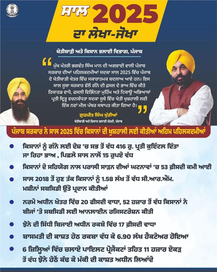 ਚੰਡੀਗੜ੍ਹ- ਮੁੱਖ ਮੰਤਰੀ ਸ. ਭਗਵੰਤ ਸਿੰਘ ਮਾਨ ਦੀ ਅਗਵਾਈ ਵਾਲੀ ਪੰਜਾਬ ਸਰਕਾਰ ਦੀਆਂ ਪਹਿਲਕਦਮੀਆਂ ਸਦਕਾ ਸਾਲ 2025 ਵਿੱਚ ਪੰਜਾਬ ਦੇ ਖੇਤੀਬਾੜੀ ਖੇਤਰ ਵਿੱਚ ਸਕਾਰਾਤਮਕ ਬਦਲਾਅ ਆਏ ਹਨ। ਇਸ ਸਾਲ ਸੂਬਾ ਸਰਕਾਰ ਵੱਲੋਂ ਗੰਨੇ ਦੀ ਫ਼ਸਲ ਦੇ ਭਾਅ ਵਿੱਚ ਕੀਤੇ ਰਿਕਾਰਡ ਵਾਧੇ, ਫਸਲੀ ਵਿਭਿੰਨਤਾ ਮੁਹਿੰਮ ਅਤੇ ਟਿਕਾਊ ਅਭਿਆਸਾਂ ਪ੍ਰਤੀ ਦ੍ਰਿੜ੍ਹ ਵਚਨਬੱਧਤਾ ਸਦਕਾ ਸੂਬੇ ਵਿੱਚ ਖੇਤੀ ਖੁਸ਼ਹਾਲੀ ਲਈ ਇੱਕ ਨਵਾਂ ਮੀਲ ਪੱਥਰ ਸਥਾਪਤ ਕੀਤਾ ਗਿਆ ਹੈ।