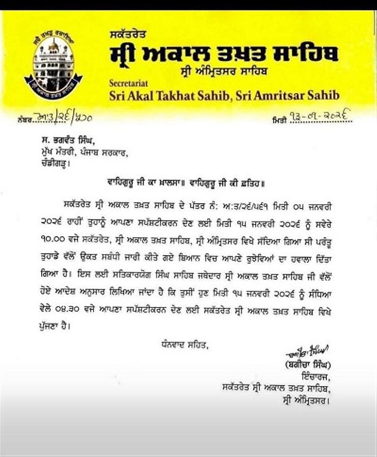 ਜਥੇਦਾਰ ਦੇ ਨਿਜੀ ਸਹਾਇਕ ਬਗੀਚਾ ਸਿੰਘ ਵਲੋ ਮੁਖ ਮੰਤਰੀ ਸ੍ਰੀ ਭਗਵੰਤ ਮਾਨ ਦੇ ਨਾਮ ਜਾਰੀ ਕੀਤੇ ਪੱਤਰ ਵਿਚ ਕਿਹਾ ਗਿਆ ਹੈ ਕਿ ਮੁਖ ਮੰਤਰੀ ਵਲੋ ਜਾਰੀ ਕੀਤੇ ਪੱਤਰ ਵਿਚ ਕੁਝ ਰੁਝੇਵਿਆਂ ਦਾ ਜਿਕਰ ਕੀਤਾ ਗਿਆ ਹੈ ਜਿਸ ਤੋ ਬਾਅਦ ਸਿੰਘ ਸਾਹਿਬ ਨੇ ਆਪ ਨੂੰ ਸ਼ਾਮ ਸਾਢੇ ਚਾਰ ਵਜੇ ਸ੍ਰੀ ਅਕਾਲ ਤਖ਼ਤ ਸਾਹਿਬ ਵਿਖੇ ਆਪਣਾ ਸ਼ਪਸ਼ਟੀਕਰਨ ਲੈ ਕੇ ਹਾਜਰ ਹੋਣ ਲਈ ਕਿਹਾ ਗਿਆ ਹੈ। ਇਸ ਸੰਬਧੀ ਜਾਣਕਾਰੀ ਮੁਤਾਬਿਕ 15 ਜਨਵਰੀ ਨੂੰ ਰਾਸ਼ਟਰਪਤੀ ਬੀਬੀ ਦਰੋਪਦੀ ਮੁਰਮੂ ਗੁਰੂ ਨਾਨਕ ਦੇਵ ਯੂਨੀਵਰਸਿਟੀ ਅੰਮ੍ਰਿਤਸਰ ਆ ਰਹੇ ਹਨ। ਮੁੱਖ ਮੰਤਰੀ ਸ੍ਰੀ ਭਗਵੰਤ ਮਾਨ ਪਹਿਲਾਂ ਹੀ ਰਾਸ਼ਟਰਪਤੀ ਦਫਤਰ ਨੂੰ ਸੂਚਿਤ ਕਰ ਚੁੱਕੇ ਹਨ ਕਿ ਉਹ ਇਸ ਸਮਾਗਮ ਵਿਚ ਸ਼ਾਮਲ ਨਹੀ ਹੋ ਸਕਣਗੇ। ਉਧਰ ਮੁੱਖ ਮੰਤਰੀ ਸ੍ਰੀ ਭਗਵੰਤ ਮਾਨ ਨੇ ਟਵੀਟ ਕਰਕੇ ਕਿਹਾ ਹੈ ਕਿ ਮੇਰਾ 15 ਜਨਵਰੀ ਨੂੰ ਕੋਈ ਰੁਝੇਵਾਂ ਨਹੀਂ ਹੈ। ਇਸ ਸਬੰਧੀ ਉਹਨਾਂ ਨੇ ਰਾਸ਼ਟਰਪਤੀ ਦਫਤਰ ਨੂੰ ਵੀ ਸੂਚਿਤ ਕਰ ਦਿੱਤਾ ਸੀ।ਸ੍ਰੀ ਮਾਨ ਨੇ ਕਿਹਾ ਕਿ ਮੈਂ 15 ਜਨਵਰੀ ਨੂੰ ਸਵੇਰੇ 10 ਵਜੇ ਨਿਮਰਤਾ ਸਹਿਤ ਹਾਜ਼ਰ ਹੋਣ ਲਈ ਤਿਆਰ ਹਾਂ।