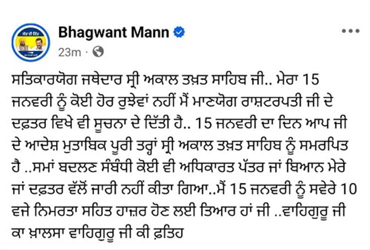 ਮੁੱਖ ਮੰਤਰੀ ਭਗਵੰਤ ਸਿੰਘ ਮਾਨ 15 ਜਨਵਰੀ ਨੂੰ ਸ੍ਰੀ ਅਕਾਲ ਤਖ਼ਤ ਸਾਹਿਬ ਅੱਗੇ ਪੇਸ਼ ਹੋਣਗੇ; ਹੋਰ ਸਾਰੇ ਪ੍ਰੋਗਰਾਮ ਰੱਦ