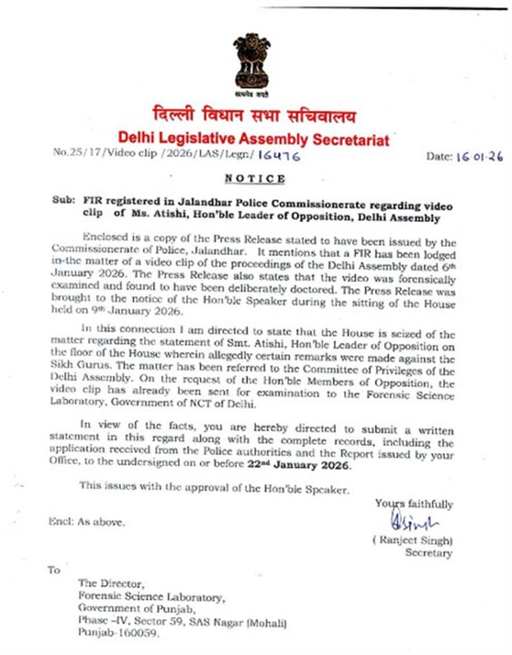 ਨਵੀਂ ਦਿੱਲੀ-ਦਿੱਲੀ ਵਿਧਾਨ ਸਭਾ ਸਕੱਤਰੇਤ ਨੇ ਜਲੰਧਰ ਪੁਲਿਸ ਕਮਿਸ਼ਨਰੇਟ ਵੱਲੋਂ ਜਾਰੀ ਪ੍ਰੈਸ ਰਿਲੀਜ਼ ਦੇ ਹਵਾਲੇ ਨਾਲ ਪੰਜਾਬ ਸਰਕਾਰ ਦੀ ਫੋਰੈਂਸਿਕ ਸਾਇੰਸ ਲੈਬਾਰਟਰੀ ਨੂੰ ਨੋਟਿਸ ਜਾਰੀ ਕੀਤਾ ਹੈ। ਇਹ ਨੋਟਿਸ 6 ਜਨਵਰੀ, 2026 ਨੂੰ ਦਿੱਲੀ ਵਿਧਾਨ ਸਭਾ ਦੀ ਕਾਰਵਾਈ ਦੇ ਇੱਕ ਵੀਡੀਓ ਕਲਿੱਪ ਨਾਲ ਸਬੰਧਤ ਹੈ, ਜਿਸ ਵਿੱਚ ਵਿਰੋਧੀ ਧਿਰ ਦੇ ਨੇਤਾ ਆਤਿਸ਼ੀ 'ਤੇ ਸਿੱਖ ਗੁਰੂਆਂ ਵਿਰੁੱਧ ਅਪਮਾਨਜਨਕ ਟਿੱਪਣੀਆਂ ਕਰਨ ਦਾ ਦੋਸ਼ ਲਗਾਇਆ ਗਿਆ ਸੀ।