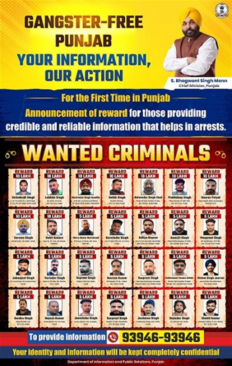 ਚੰਡੀਗੜ੍ਹ-ਭਗਵੰਤ ਮਾਨ ਦੀ ਅਗਵਾਈ ਹੇਠ ਪੰਜਾਬ ਸਰਕਾਰ ਨੇ ਇਤਿਹਾਸਕ ਫ਼ੈਸਲਾ ਲੈਂਦਿਆਂ 'ਪੁਰਸਕਾਰ ਨੀਤੀ’ ਤਹਿਤ ਪੰਜਾਬ ਪੁਲਿਸ ਨੂੰ ਸੂਬੇ ਵਿੱਚ ਲੋੜੀਂਦੇ ਅਪਰਾਧੀਆਂ/ਗੈਂਗਸਟਰਾਂ ਅਤੇ ਉਨ੍ਹਾਂ ਦੇ ਨੈੱਟਵਰਕ ਬਾਰੇ ਭਰੋਸੇਯੋਗ ਜਾਣਕਾਰੀ ਦੇਣ ਵਾਲੇ ਵਿਅਕਤੀਆਂ ਨੂੰ ਪੁਰਸਕਾਰ ਦੇਣ ਦੇ ਅਧਿਕਾਰ ਦਿੱਤੇ ਹਨ। ਇਸ ਸਬੰਧੀ ਪੰਜਾਬ ਸਰਕਾਰ ਨੇ 28 ਸਭ ਤੋਂ ਲੋੜੀਂਦੇ ਅਪਰਾਧੀਆਂ ਦੀ ਸੂਚੀ ਵੀ ਜਾਰੀ ਕੀਤੀ ਹੈ।